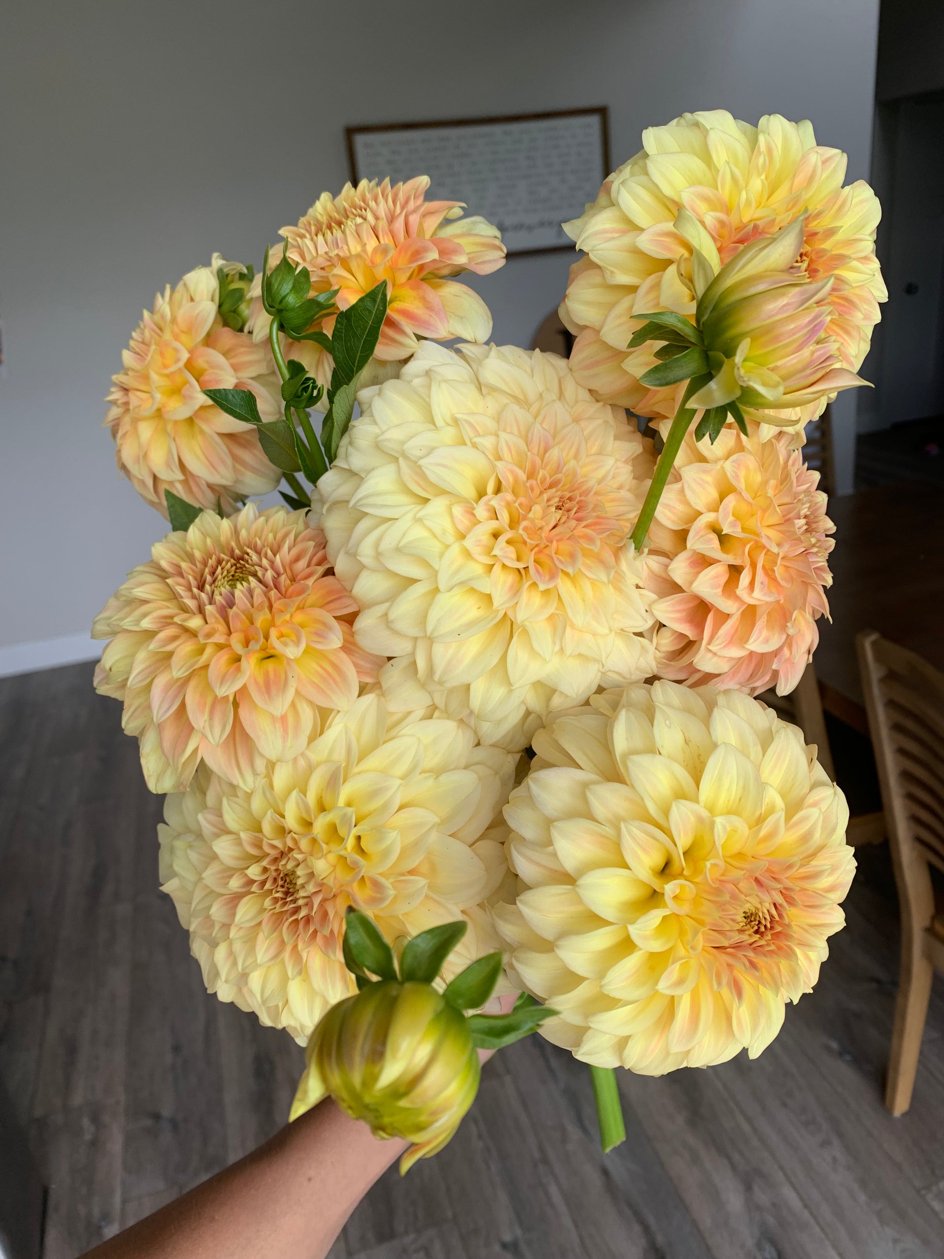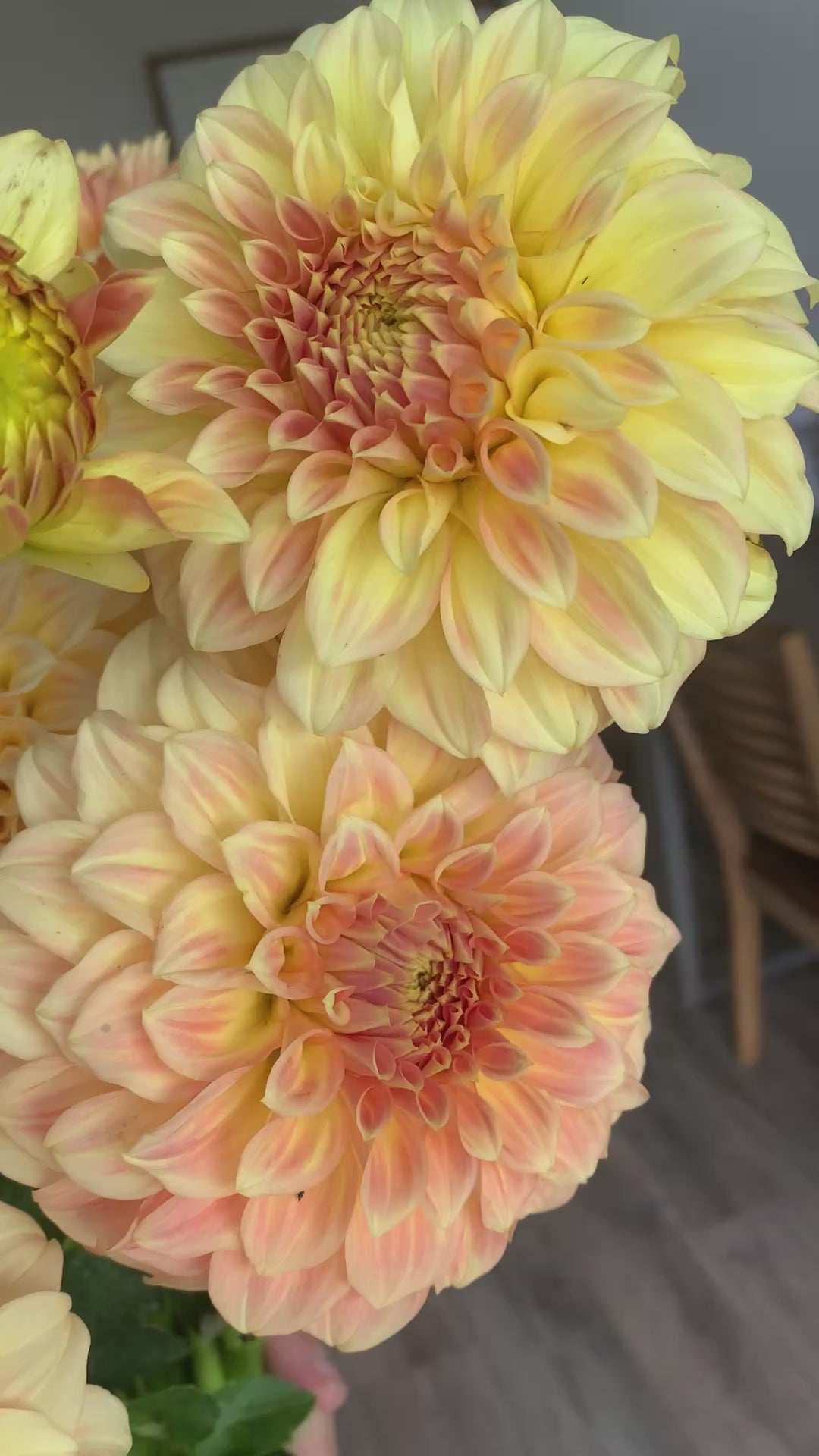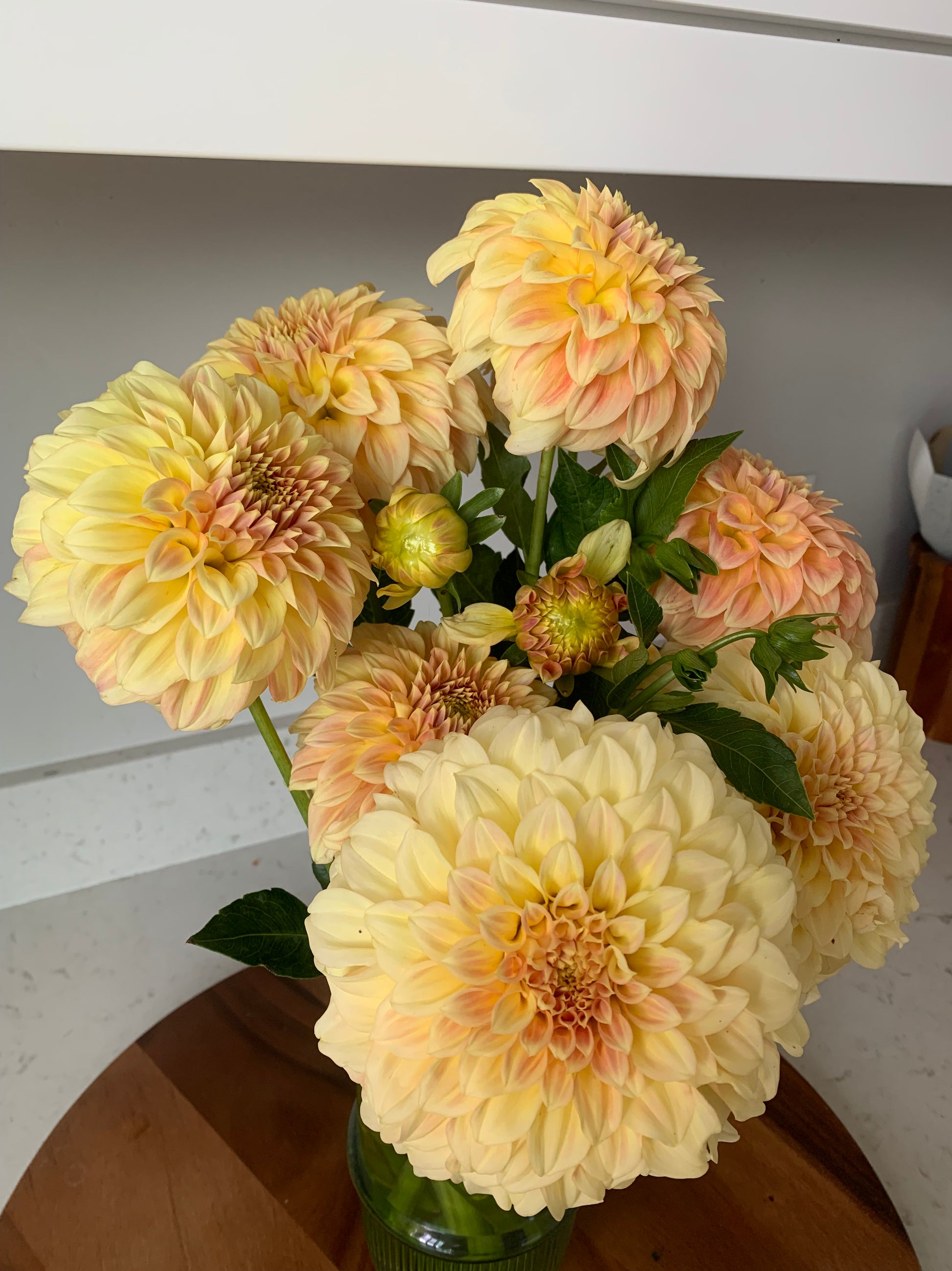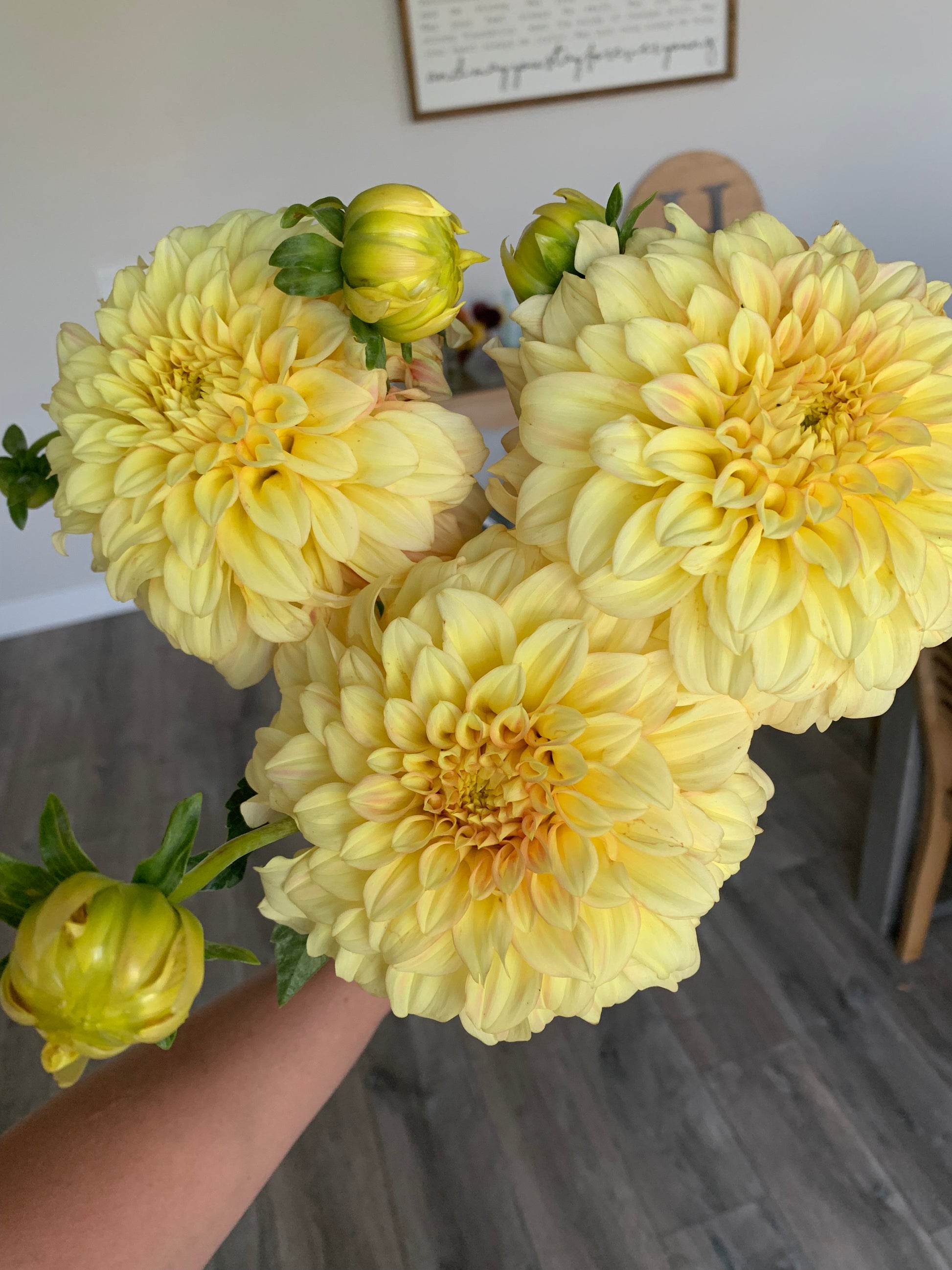 Giant strikingly gorgeous yellow and sometimes peachy ball shaped blooms depending on light, water, soil, etc, good cut flower, prolific blooms. Wonderful in the garden, always covered in happy bright bursting blooms of sunshine.
