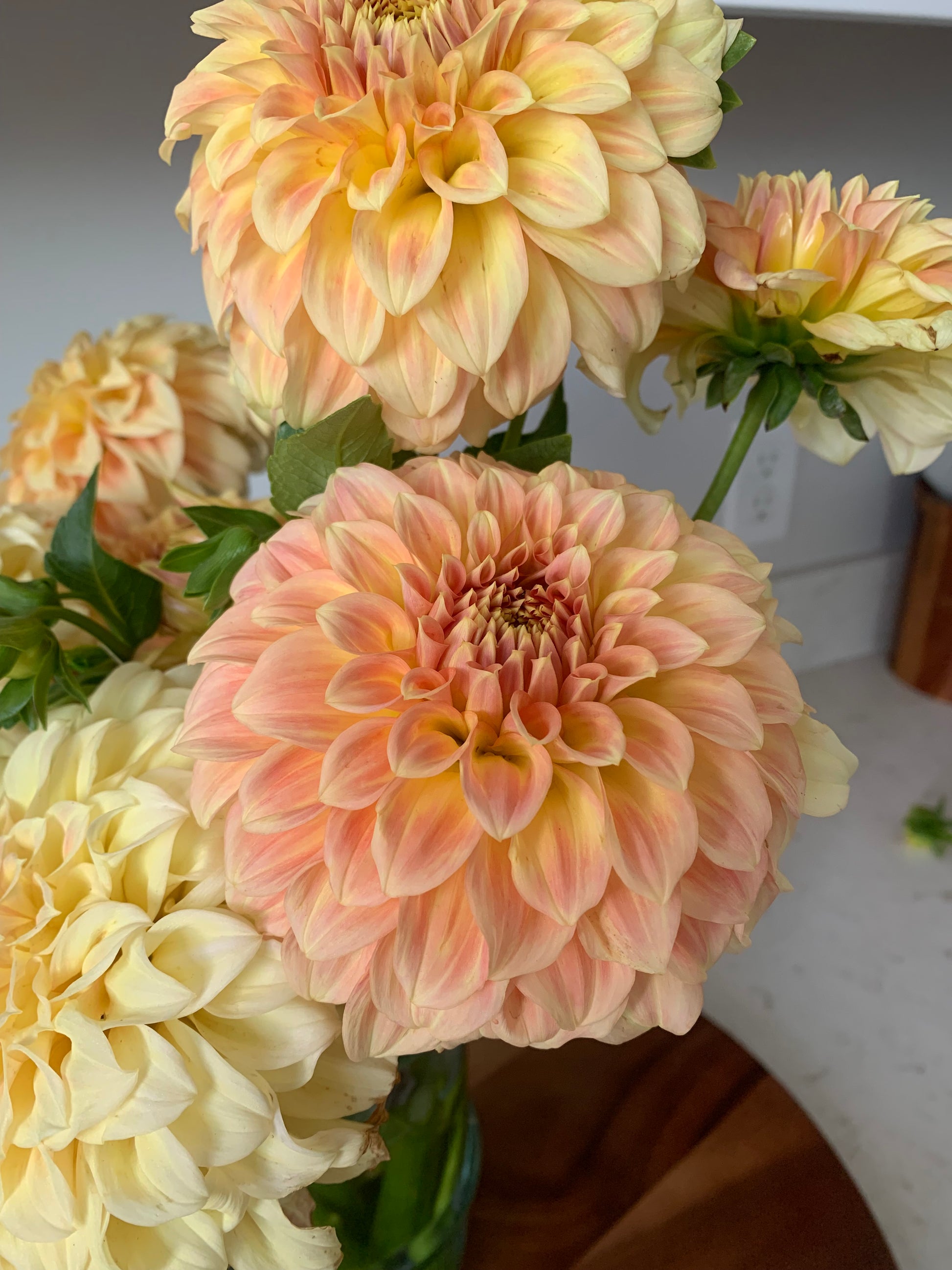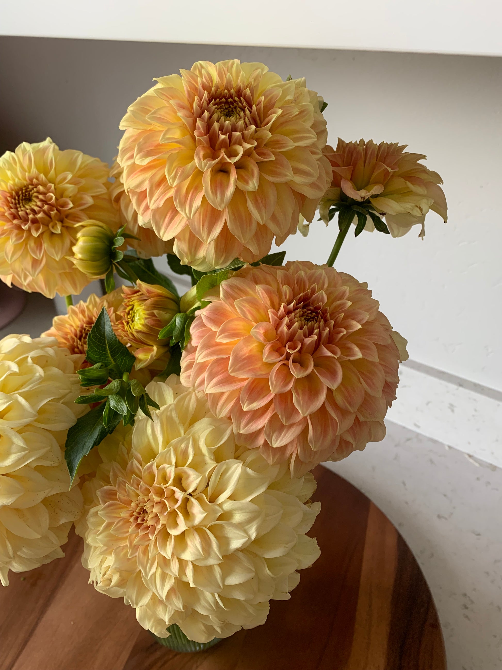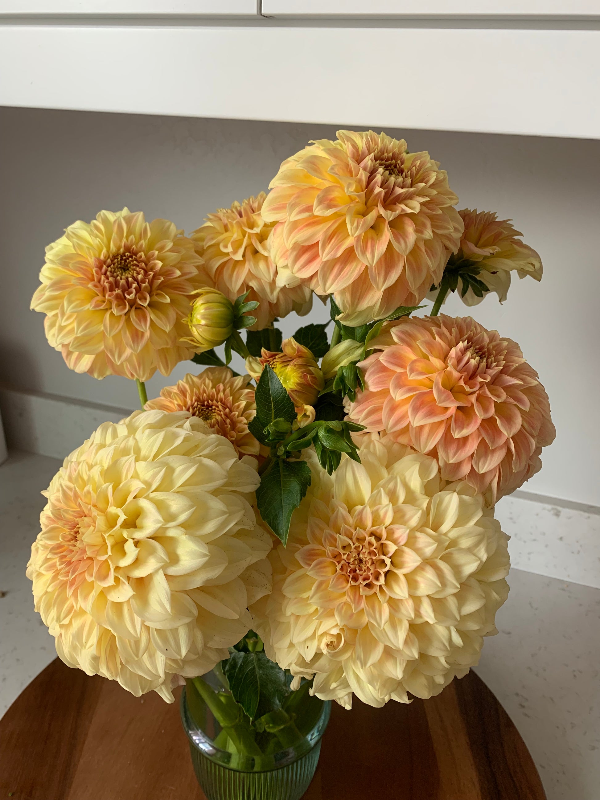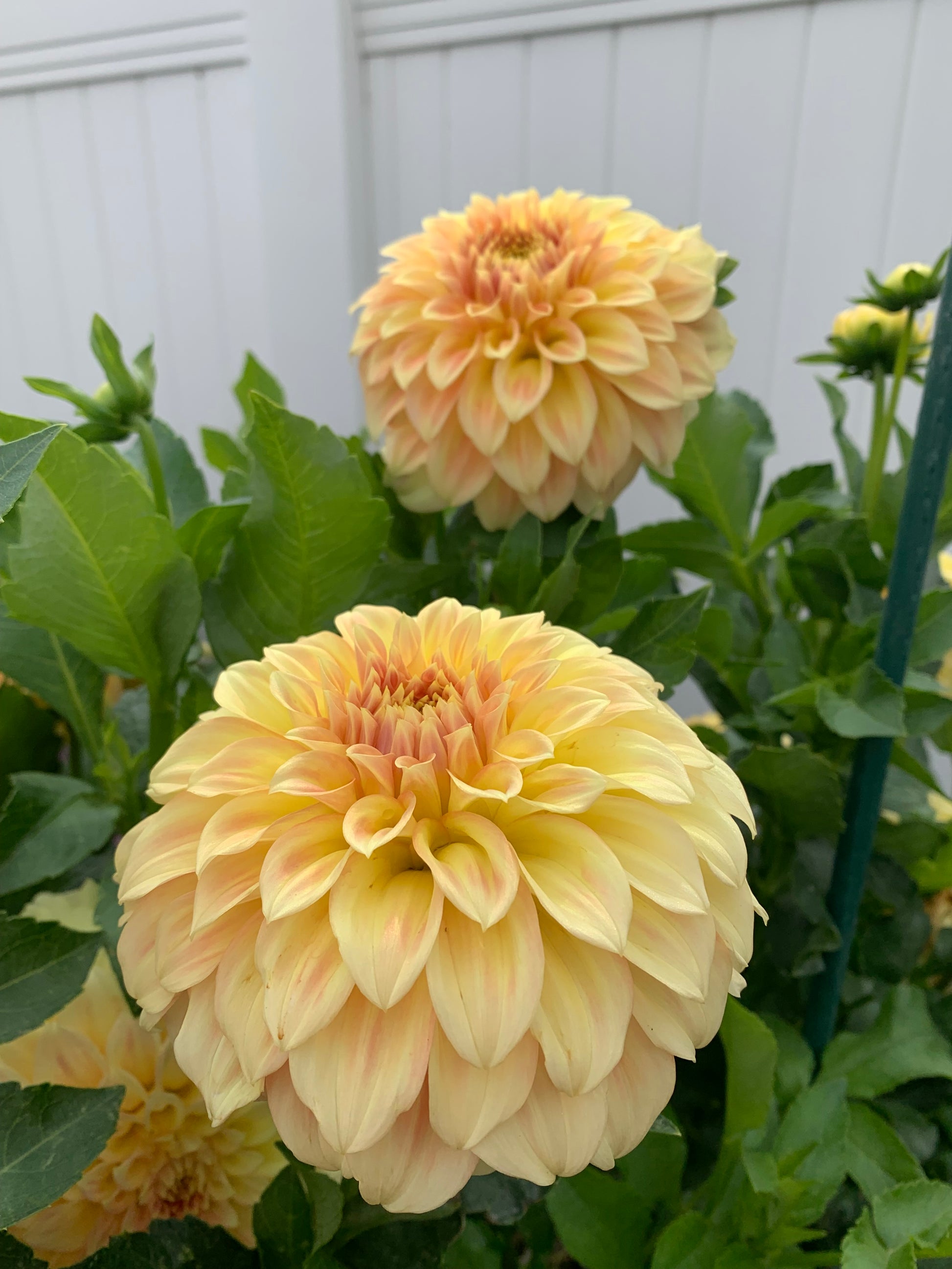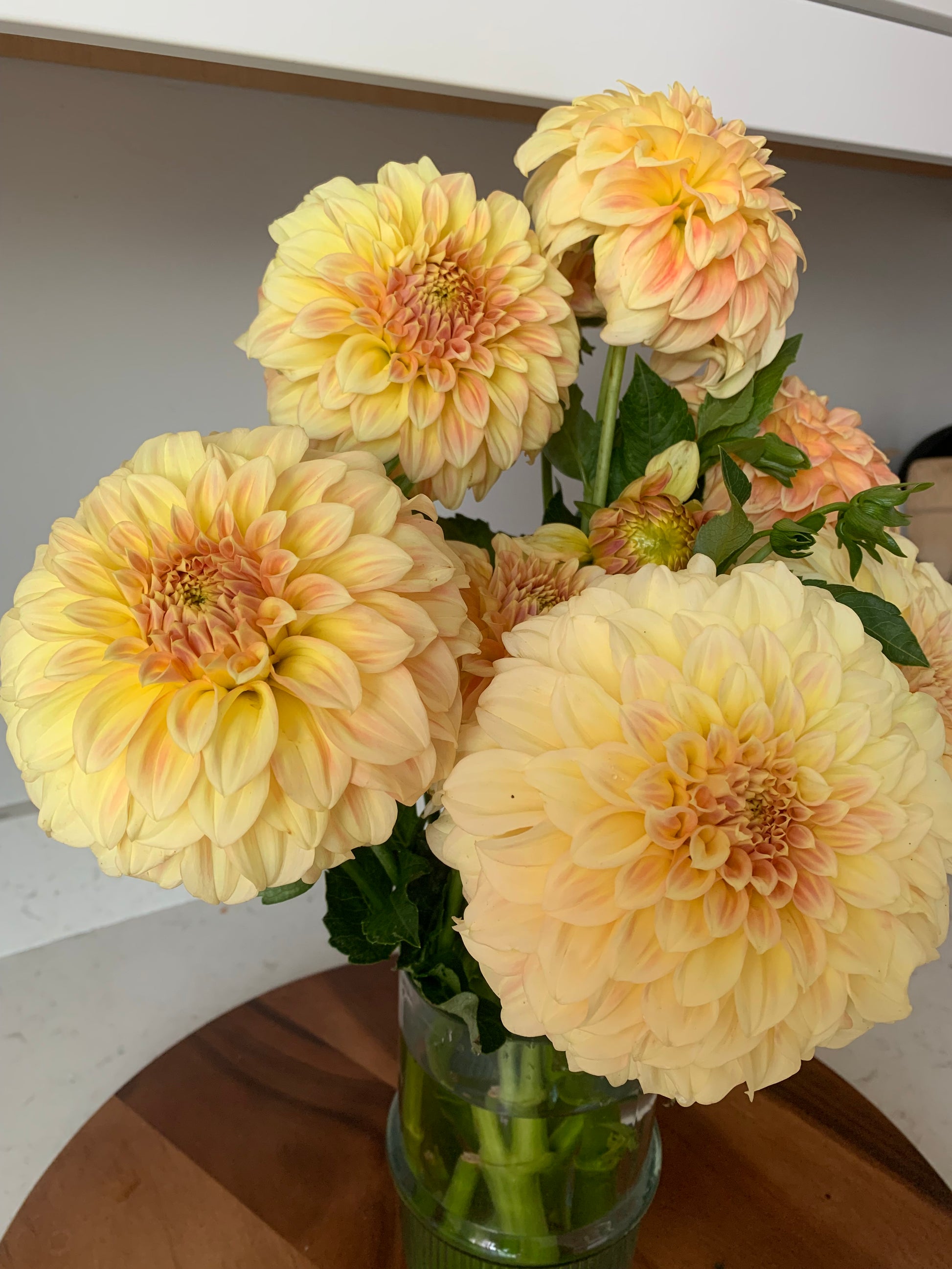 Giant strikingly gorgeous yellow and sometimes peachy ball shaped blooms depending on light, water, soil, etc, good cut flower, prolific blooms. Wonderful in the garden, always covered in happy bright bursting blooms of sunshine.