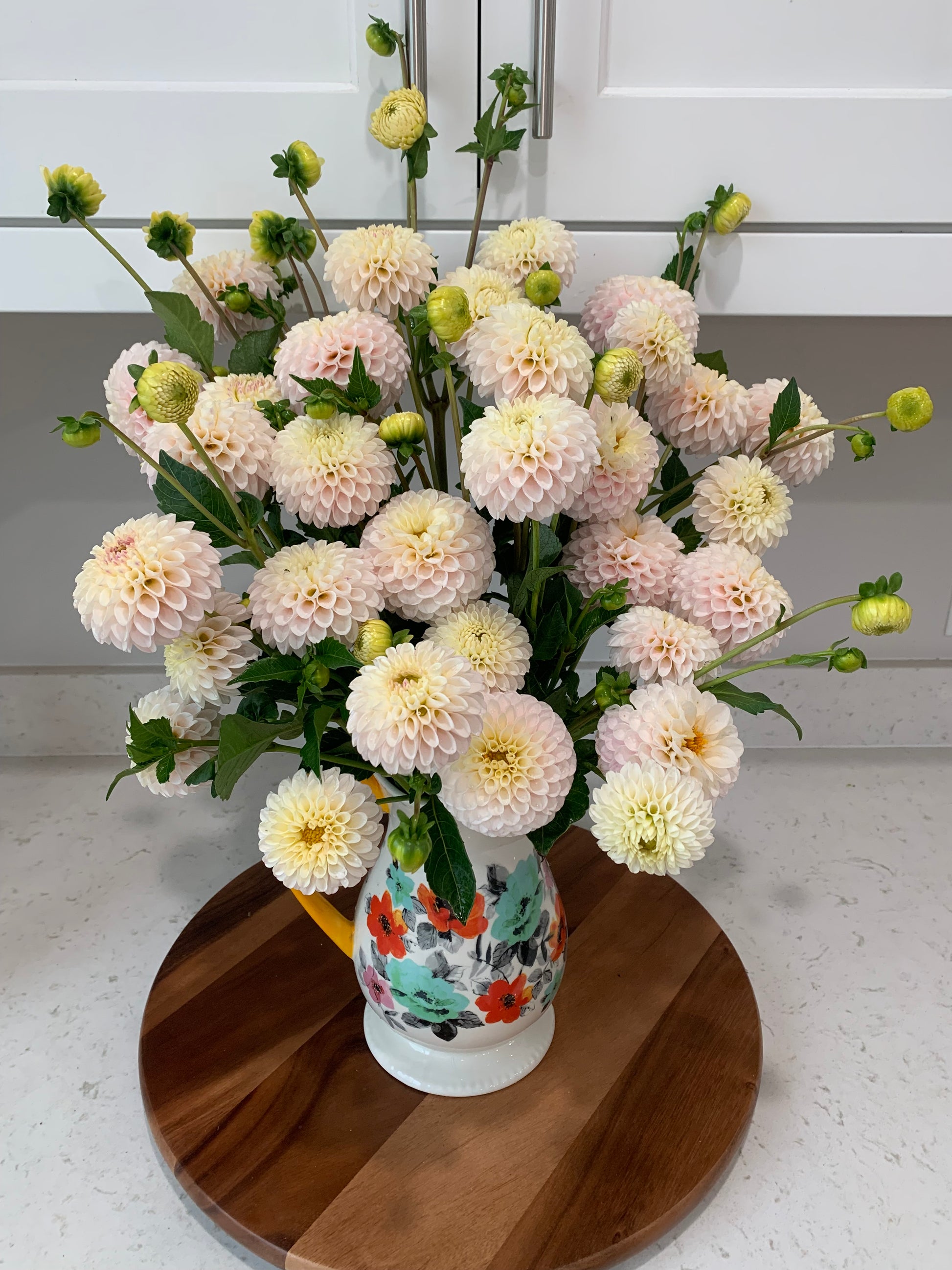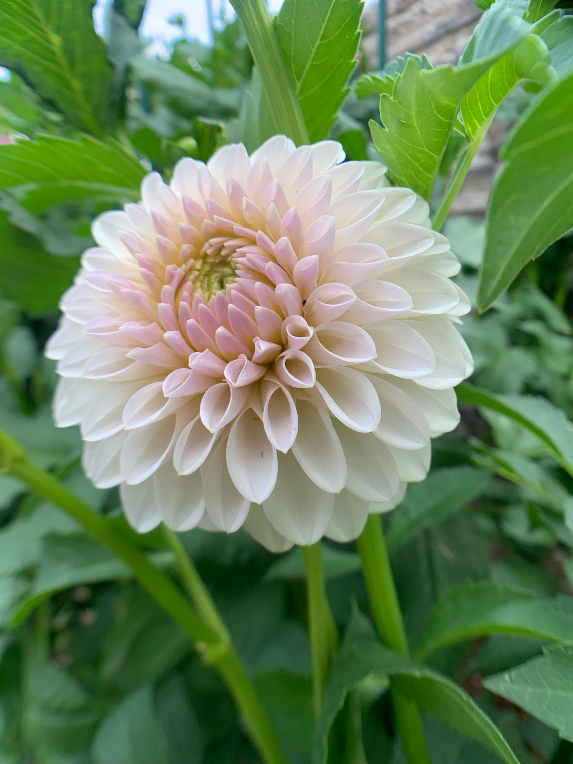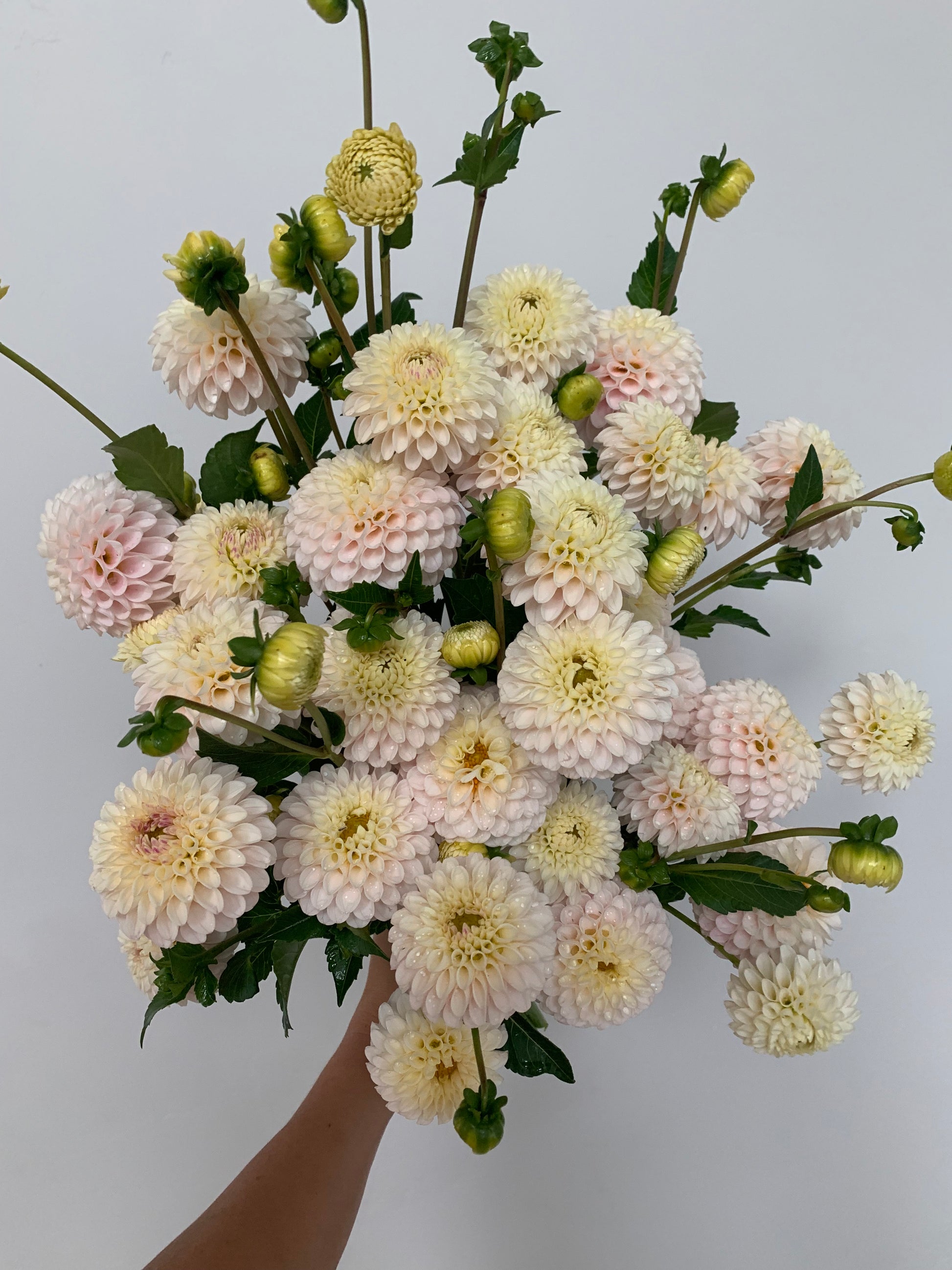 White blooms tinged in blush, this is one of my best producing dahlias. Loads of compact white ball shaped blooms that bloom non-stop all dahlia season, wonderful cut flower with long stems. In the fall with less sun the blooms turn more of a blush tone for me each year. Florist/wedding favorite, must have work horse in my garden.
