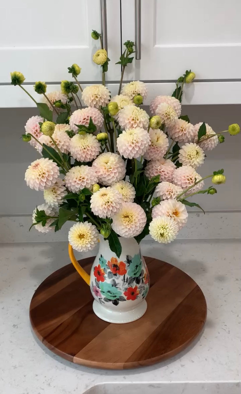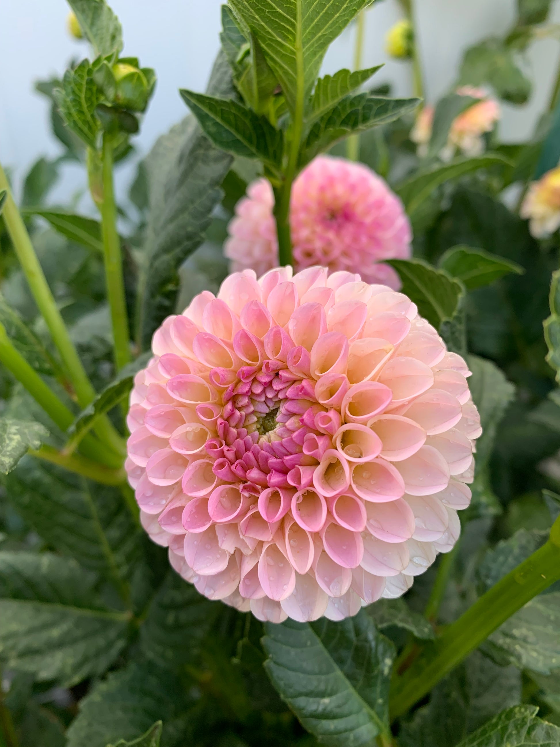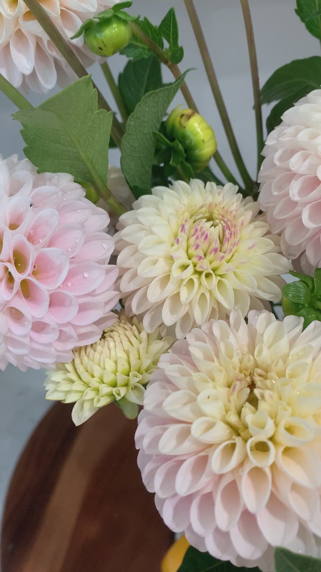 White blooms tinged in blush, this is one of my best producing dahlias. Loads of compact white ball shaped blooms that bloom non-stop all dahlia season, wonderful cut flower with long stems. In the fall with less sun the blooms turn more of a blush tone for me each year. Florist/wedding favorite, must have work horse in my garden.