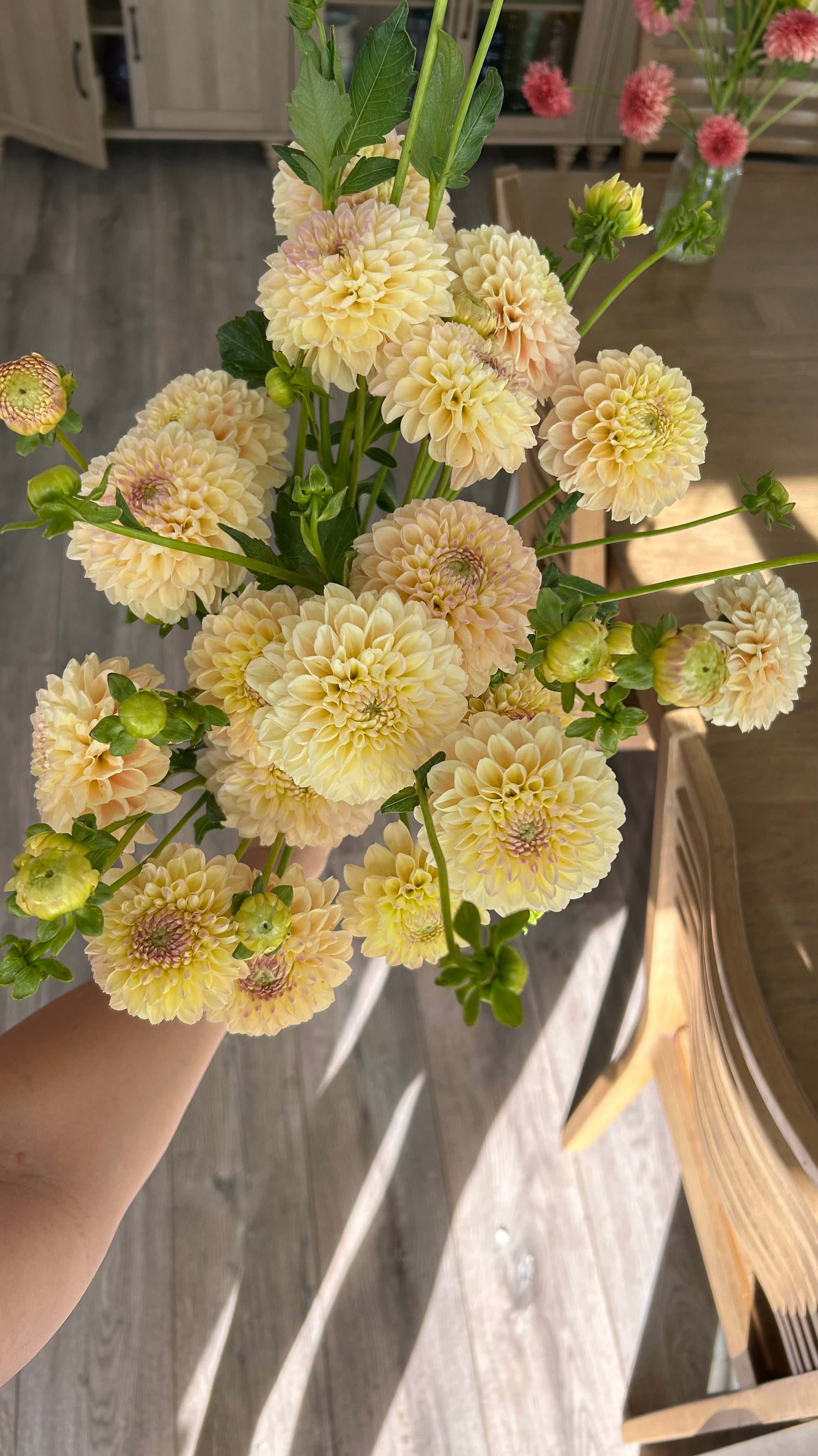 French Doll is one of my most absolute favorite dahlias!! Yellow centered petals that fade into coral pink tips that face upward, tons of blooms, great stems for cutting, good vase life, delicate sweet look, colors vary depending on light in the later fall, one of my tried and true favorites.