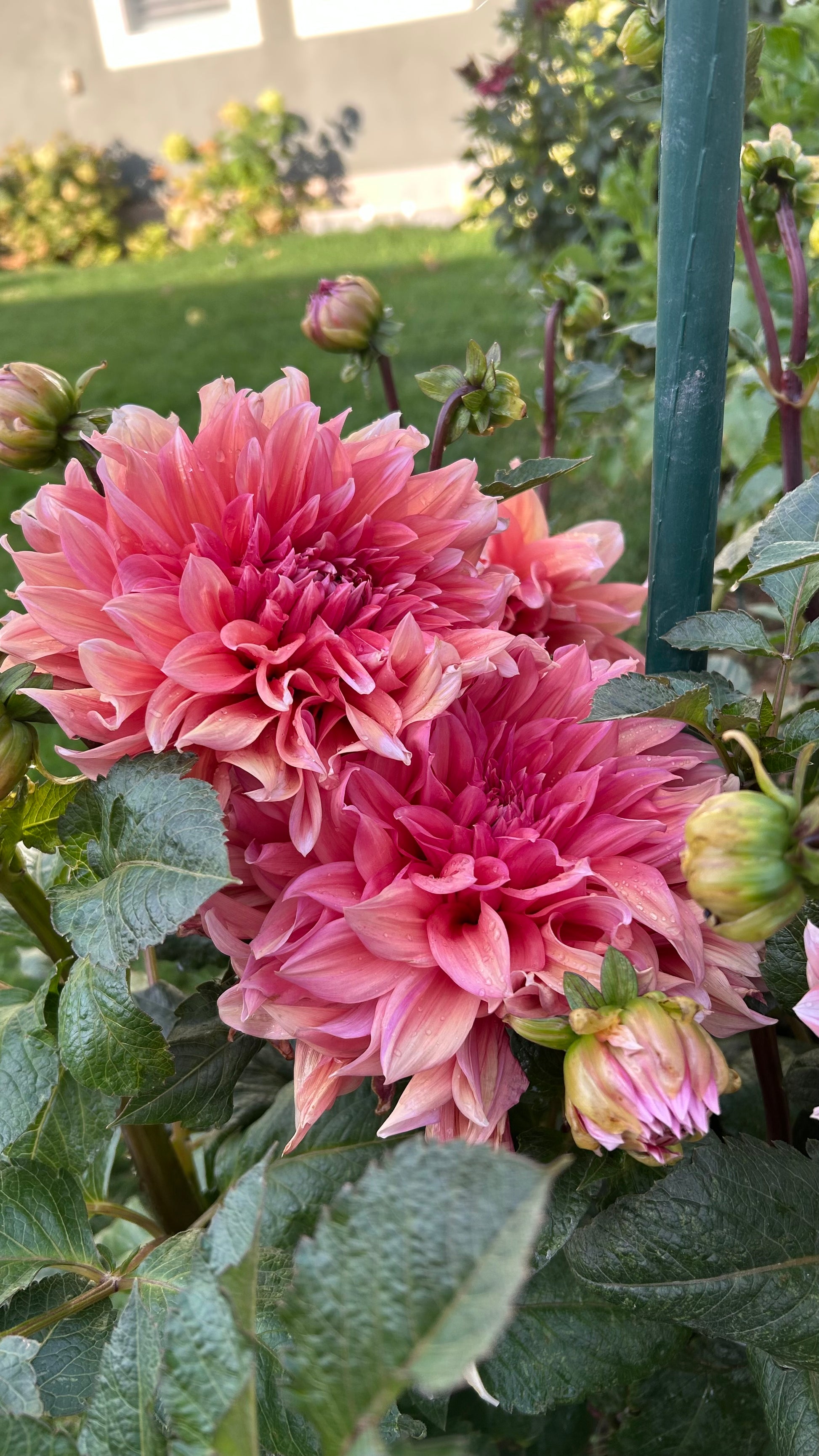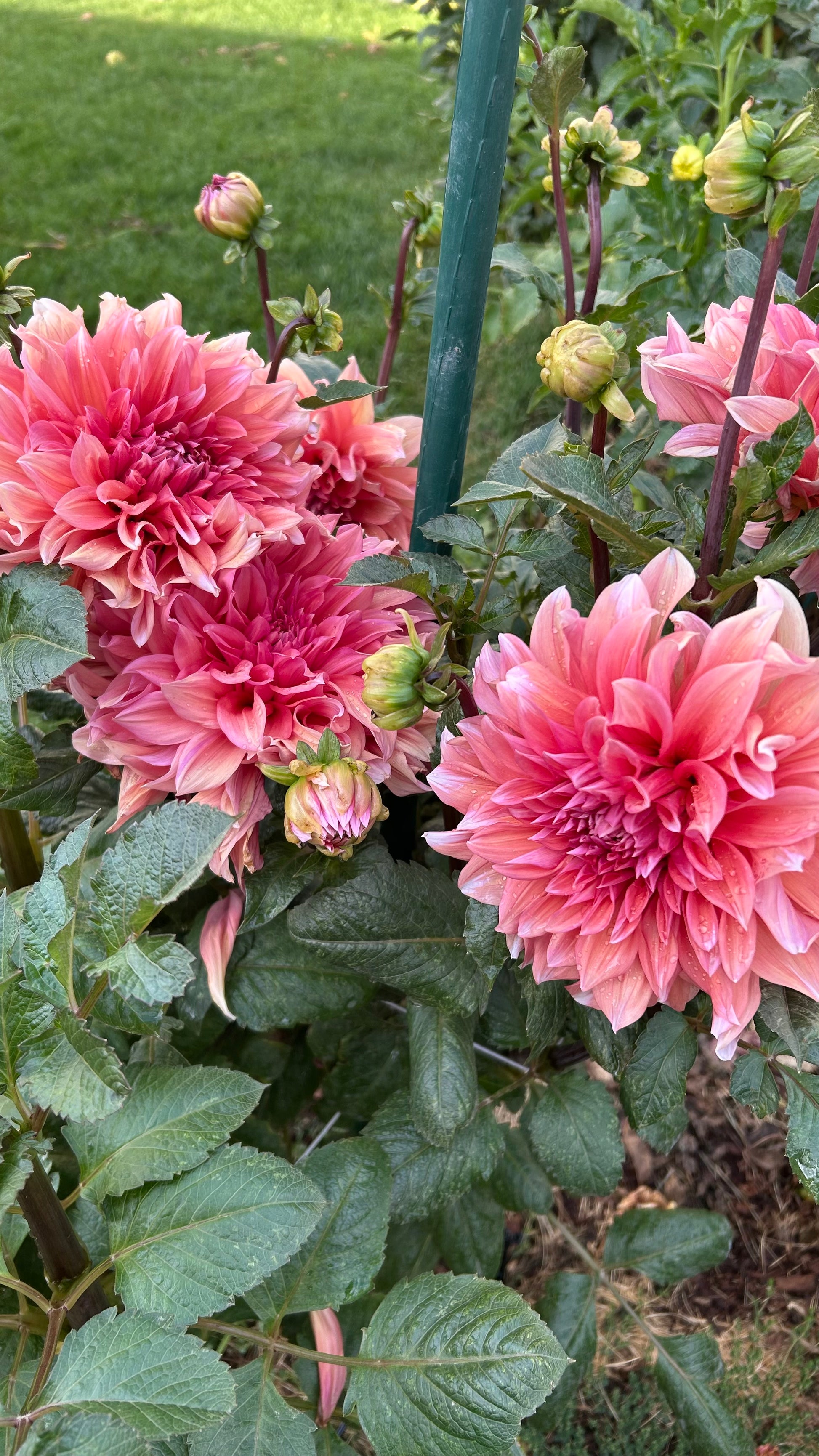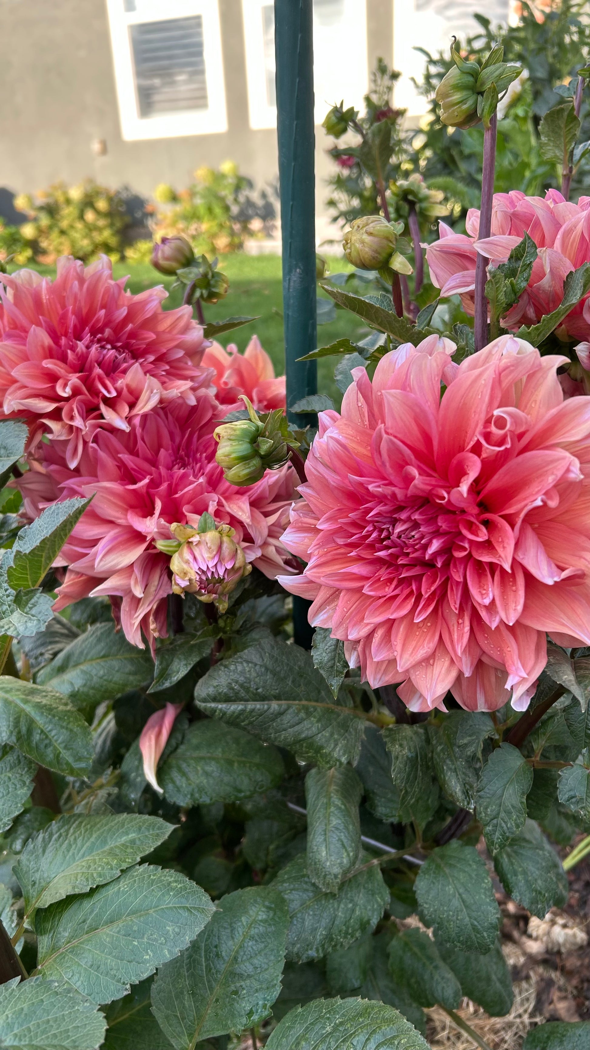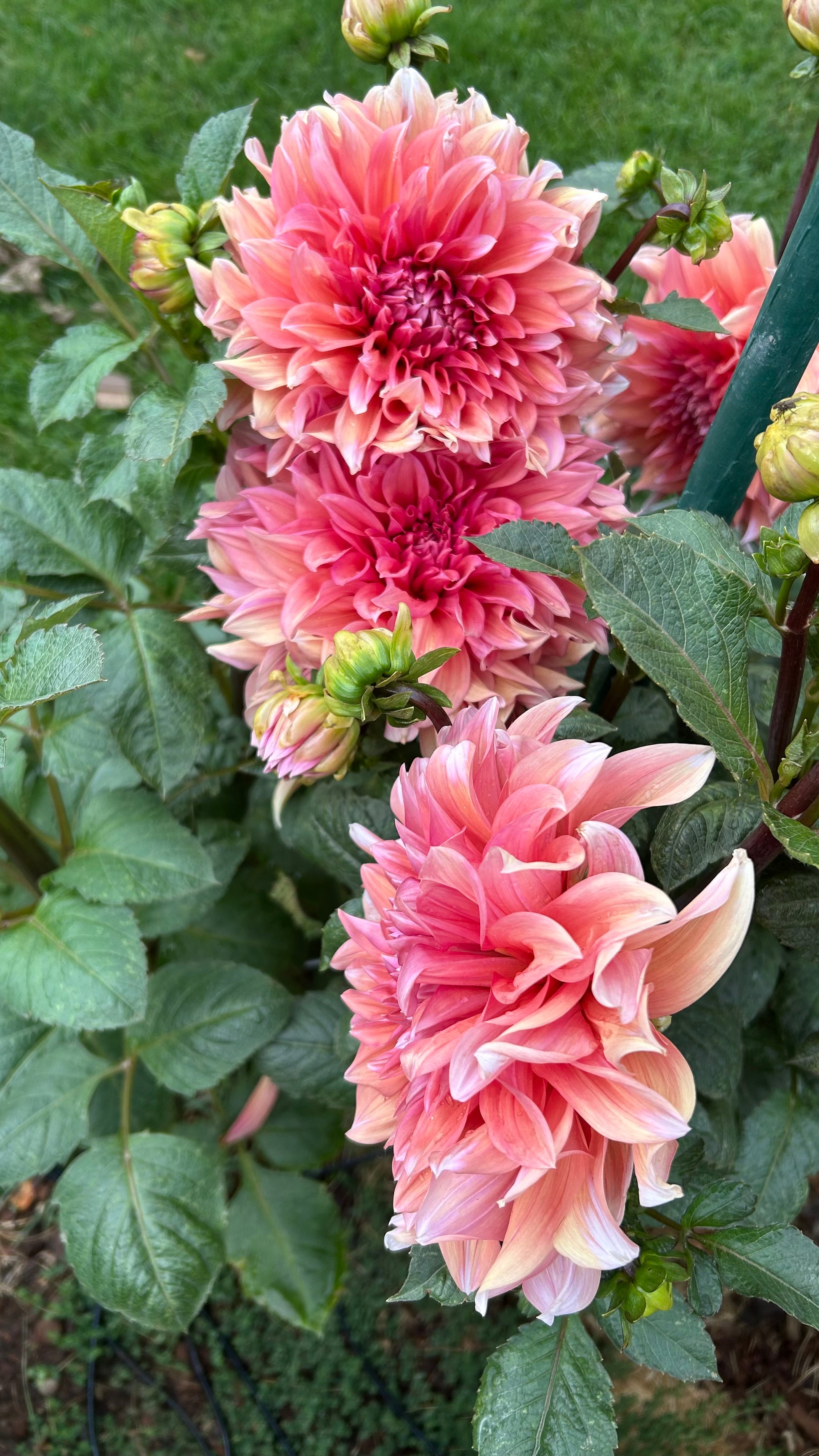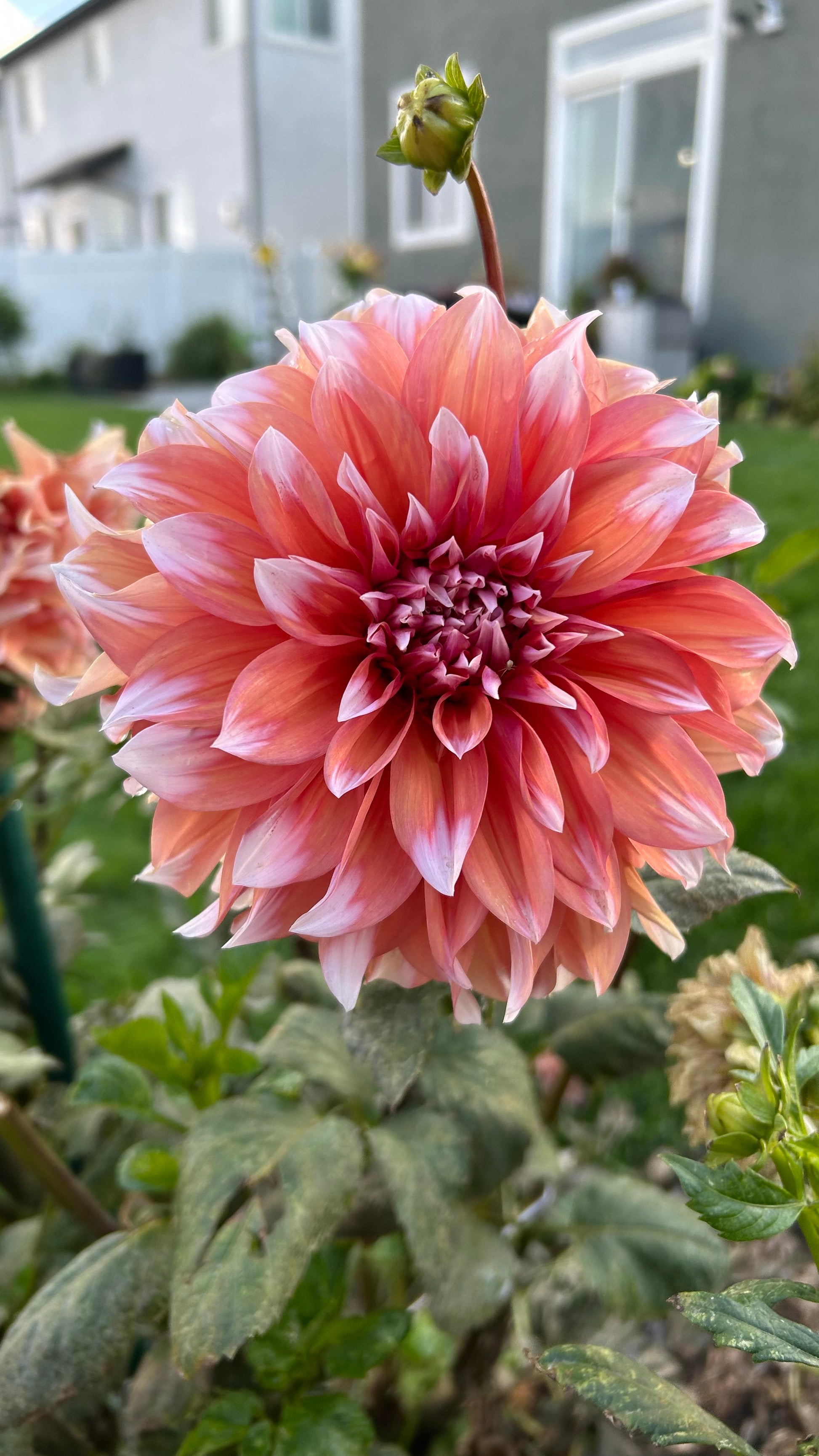 Massive dinner plate orange blooms tipped in white. Consistent blooms, okay vase life as far as AA dahlias go!