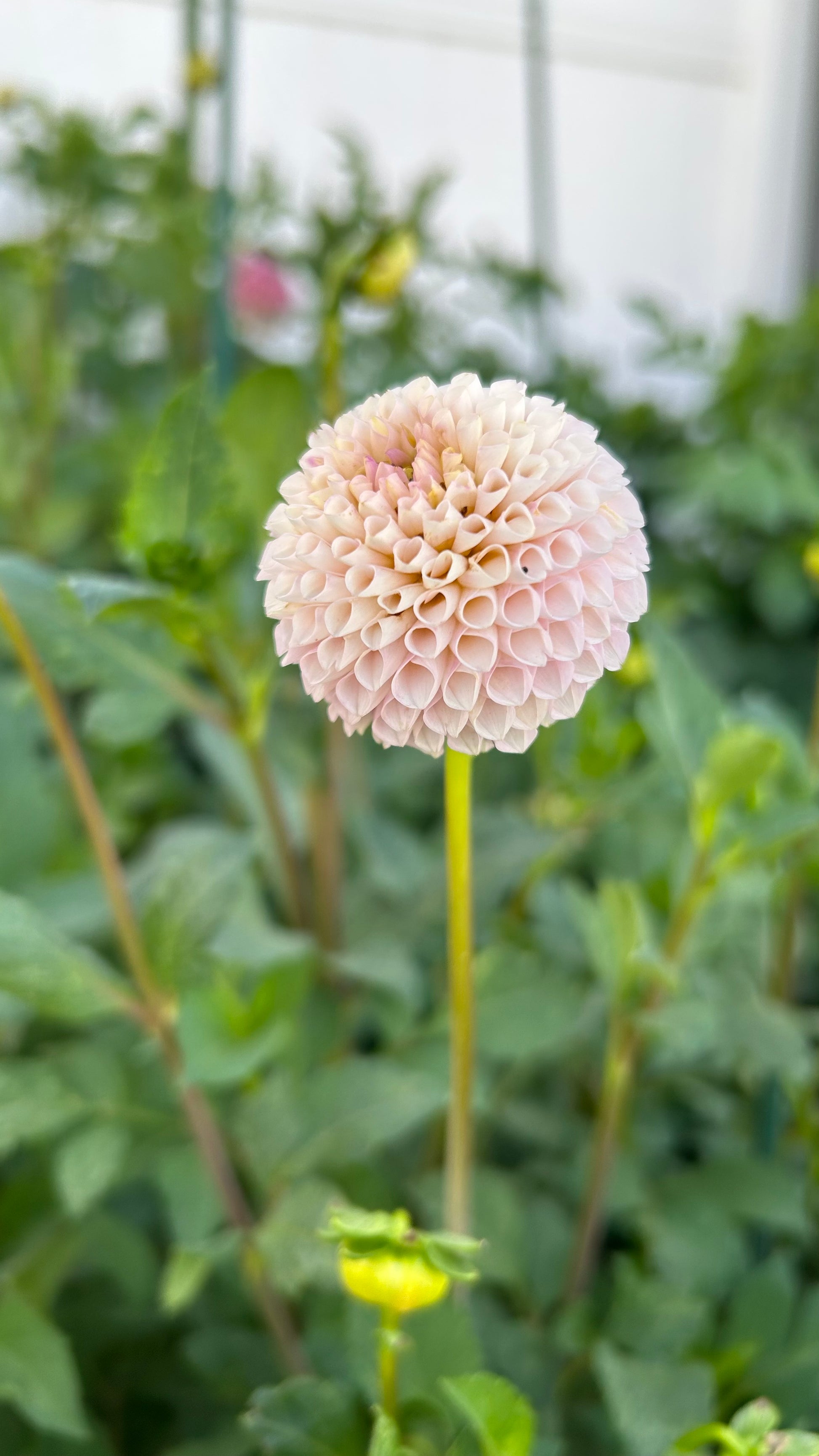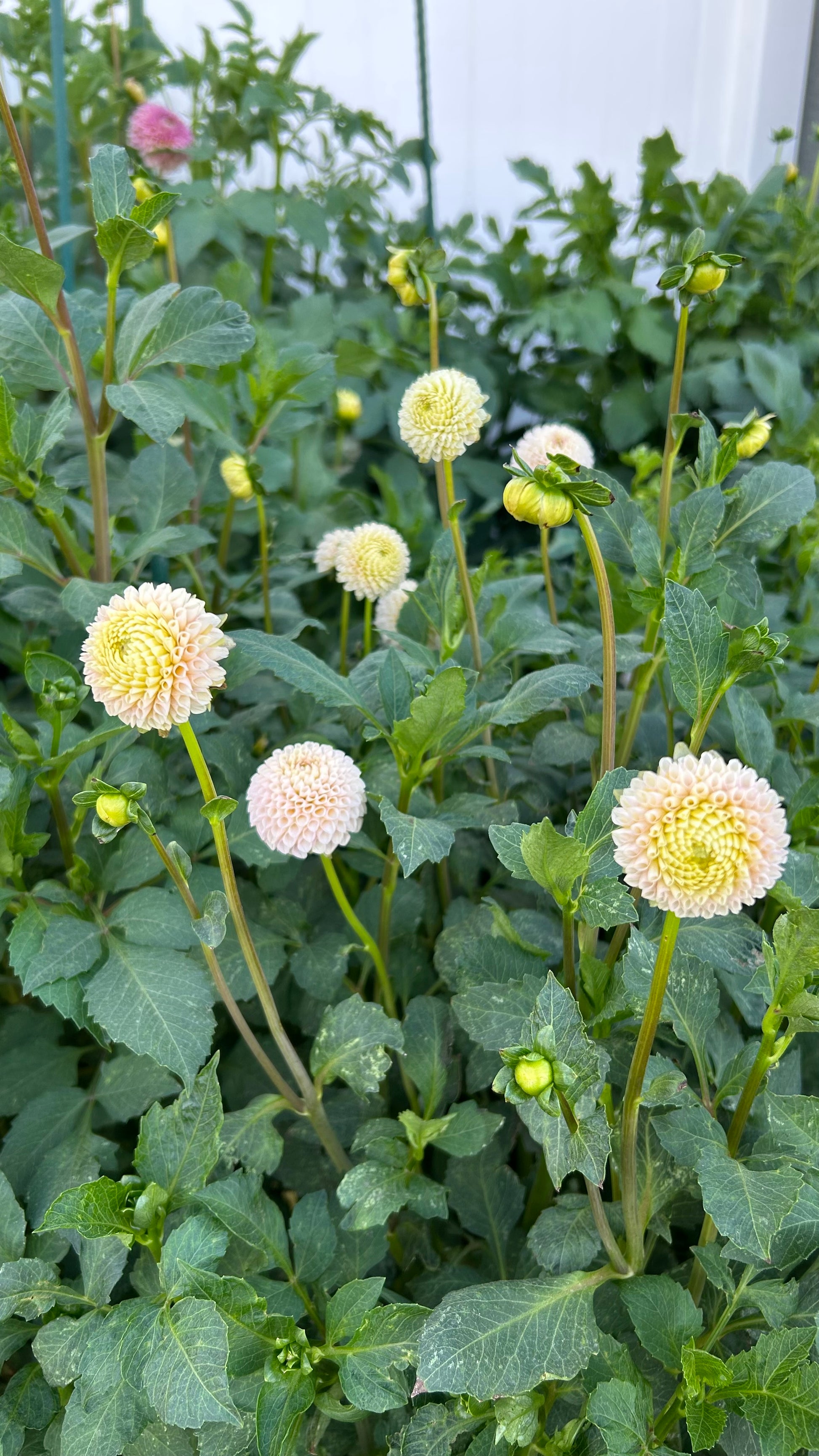 Small ball shaped blooms in a soft blush champagne color, long stems for cutting, good vase life, great bloomer, adorable addition to the garden.