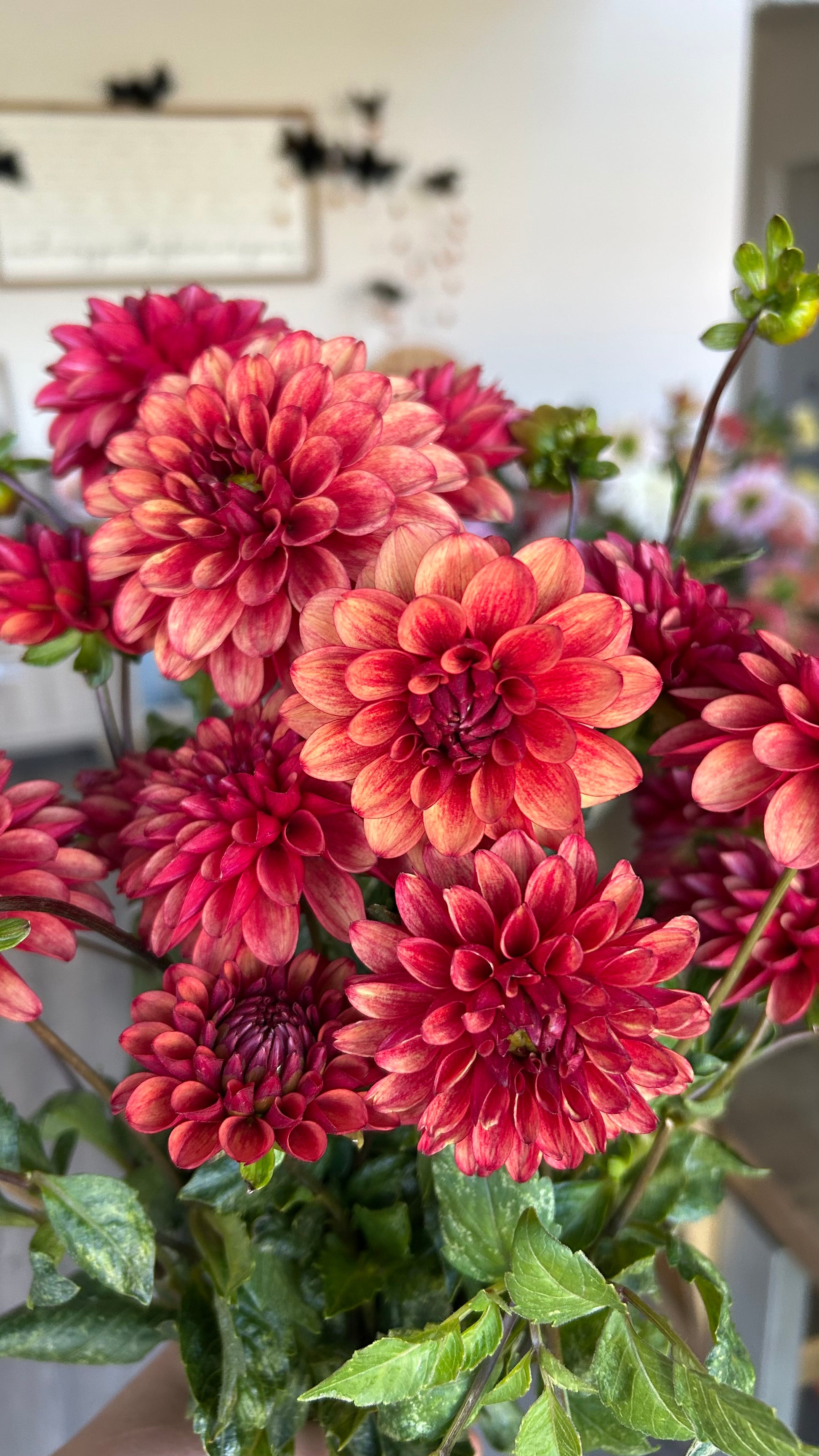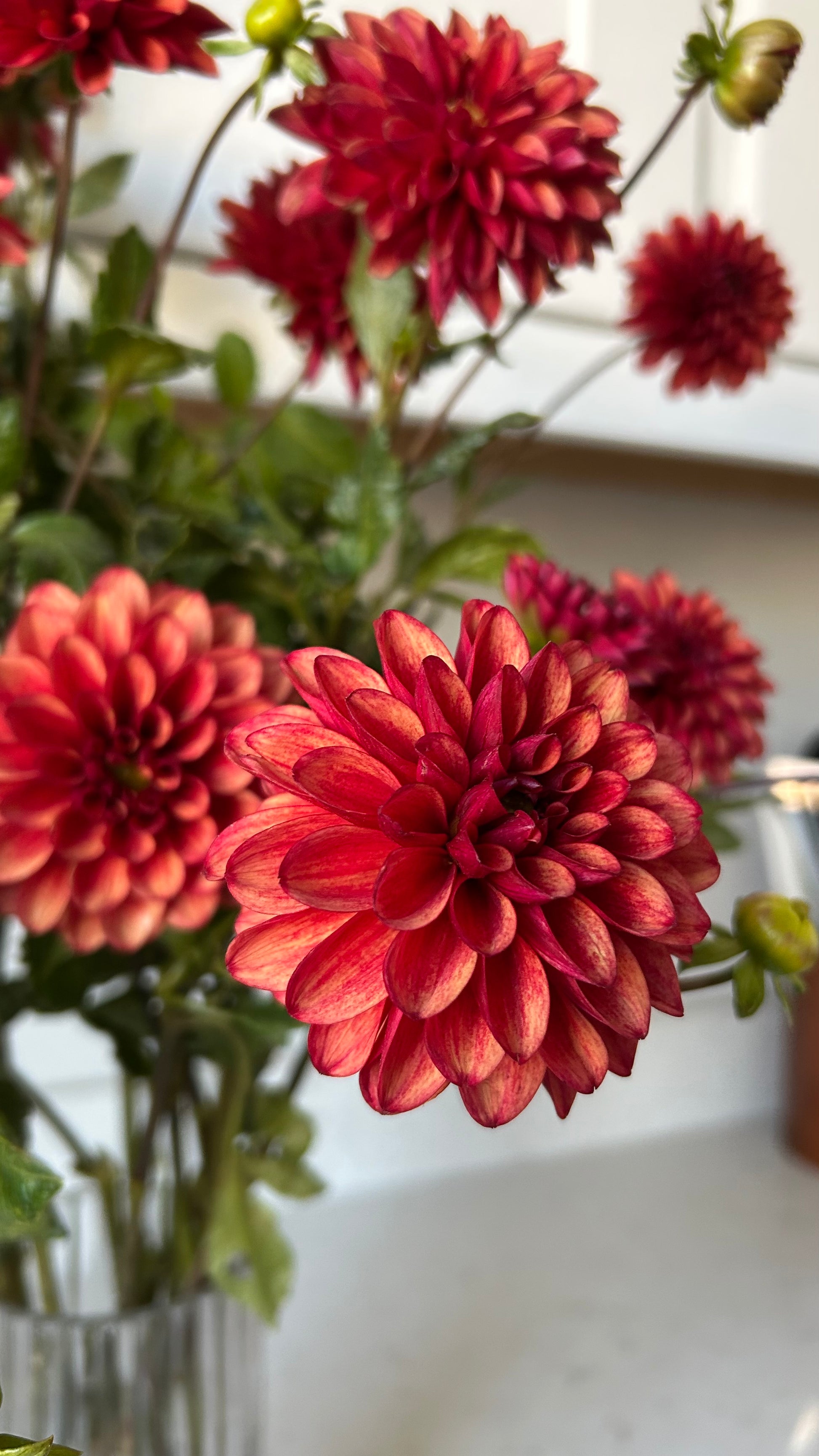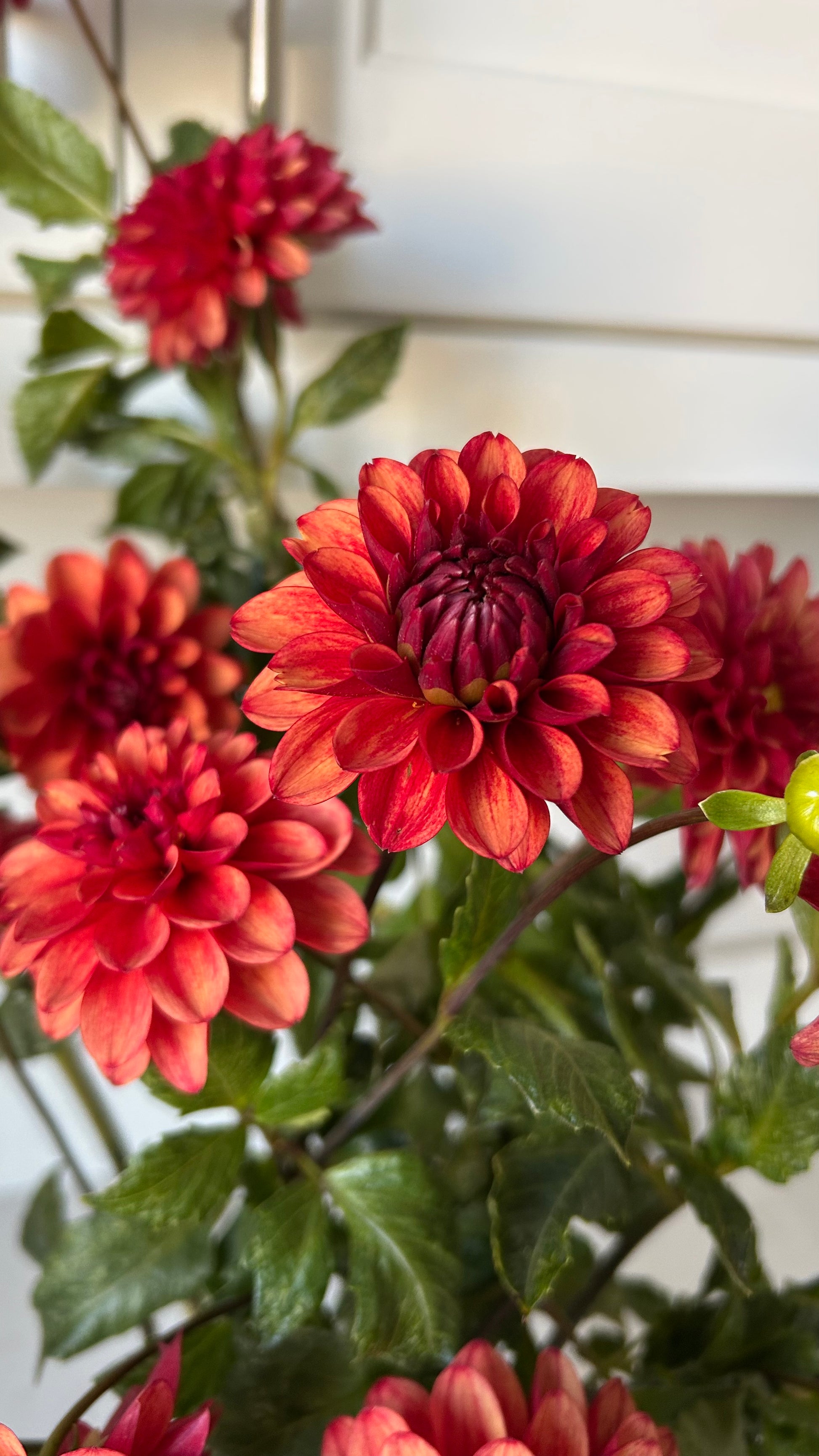 Red blooms with a slightly darker red flush along the back side of the petals. Perfect for fall bouquets. Great vase life, tons of blooms all season long.