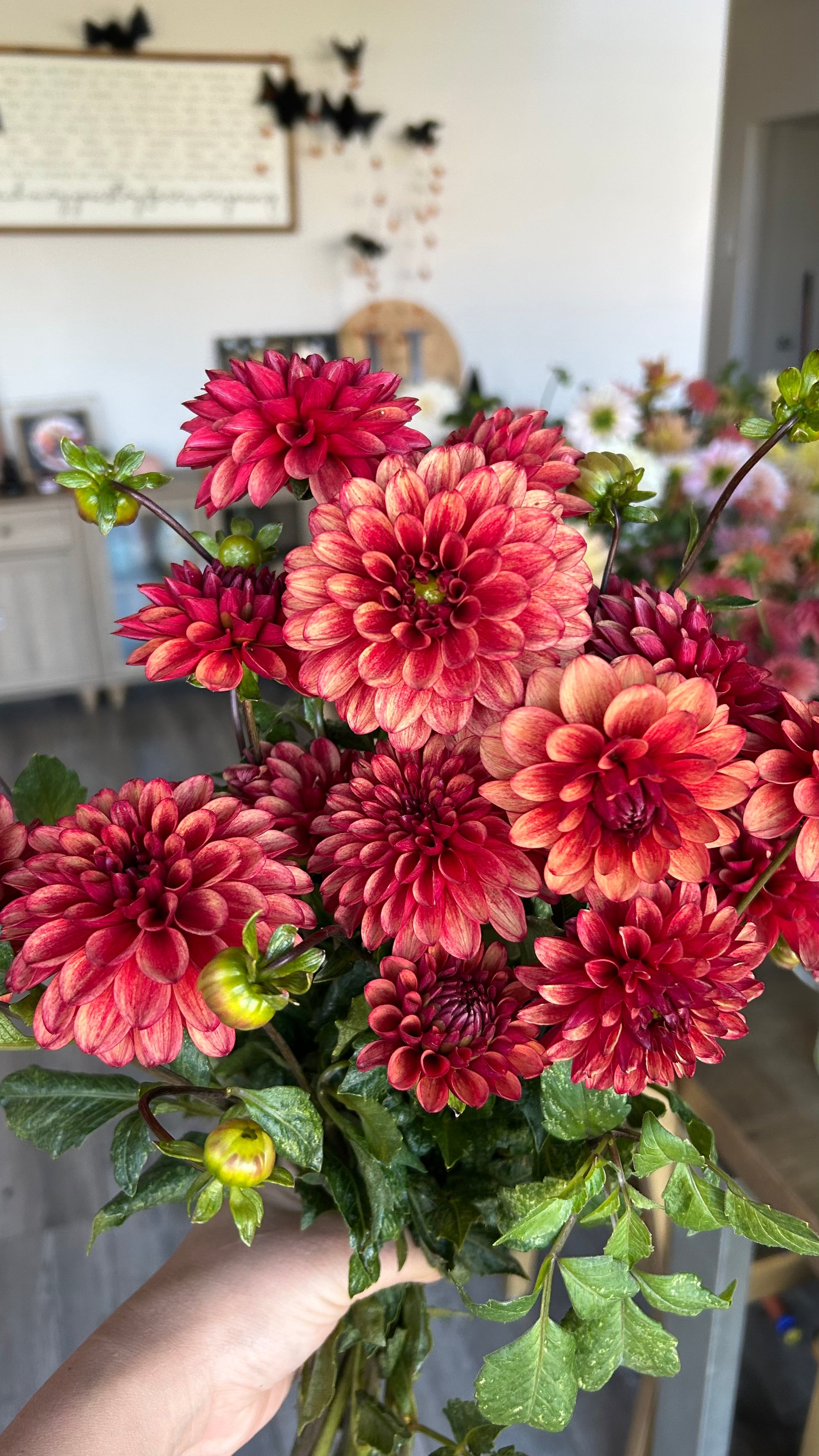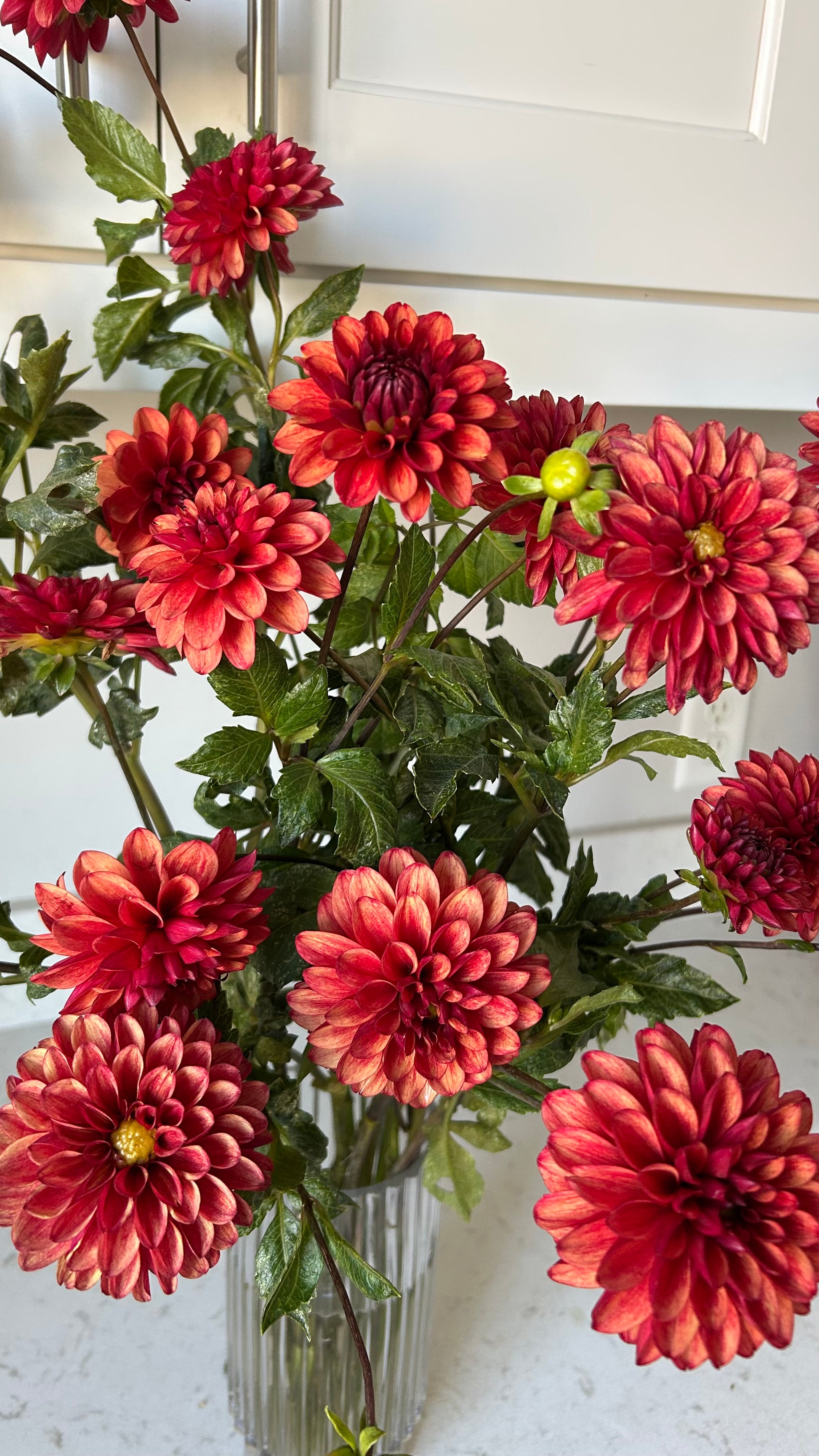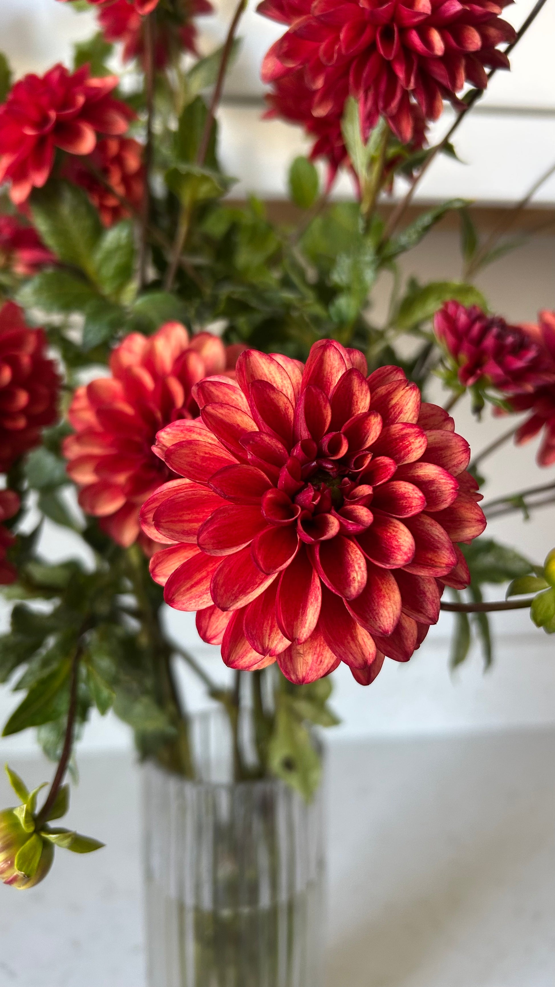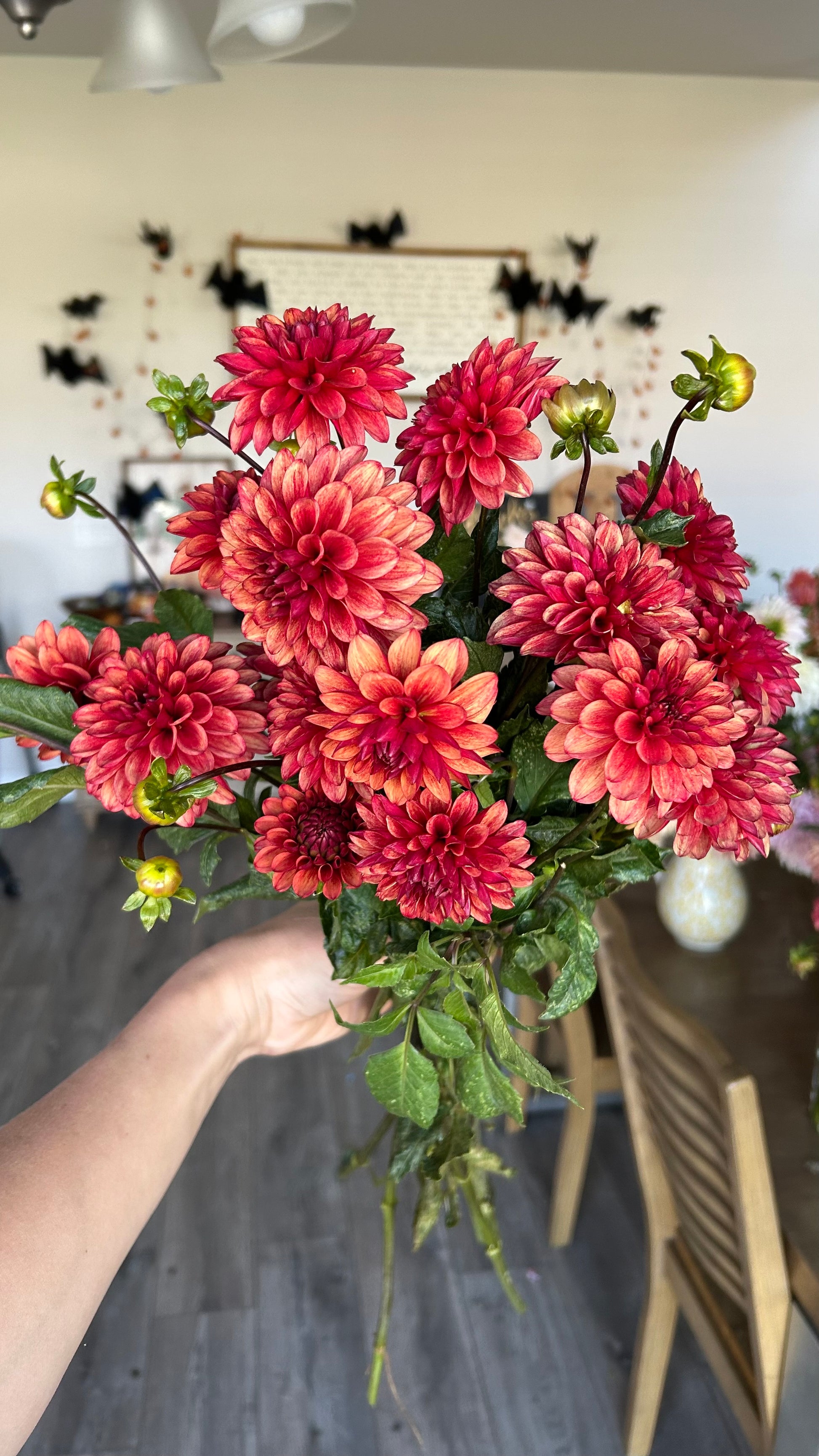 Red blooms with a slightly darker red flush along the back side of the petals. Perfect for fall bouquets. Great vase life, tons of blooms all season long.