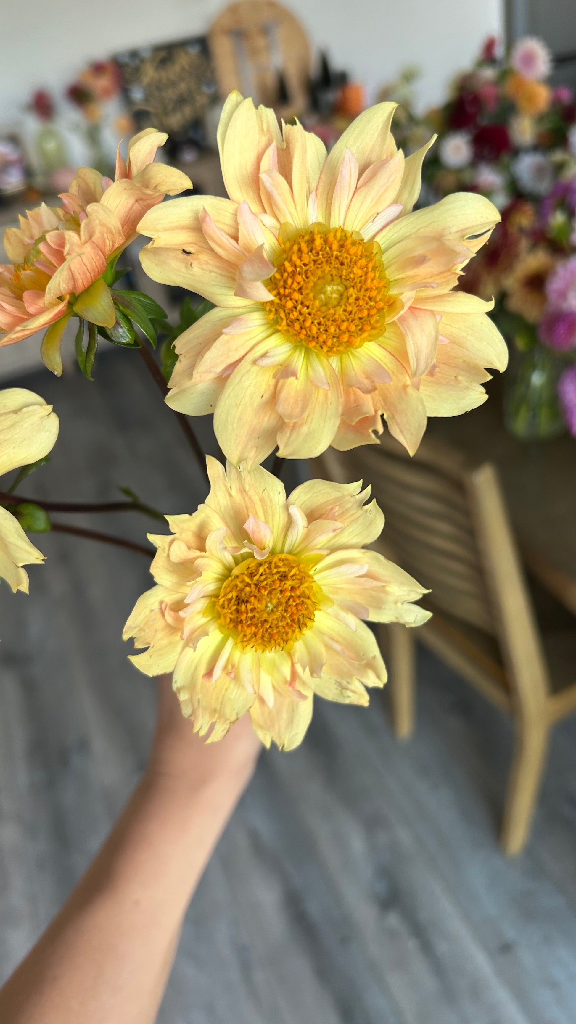 Collarette peachy blooms on long stems, great pollinator, good cut flower.