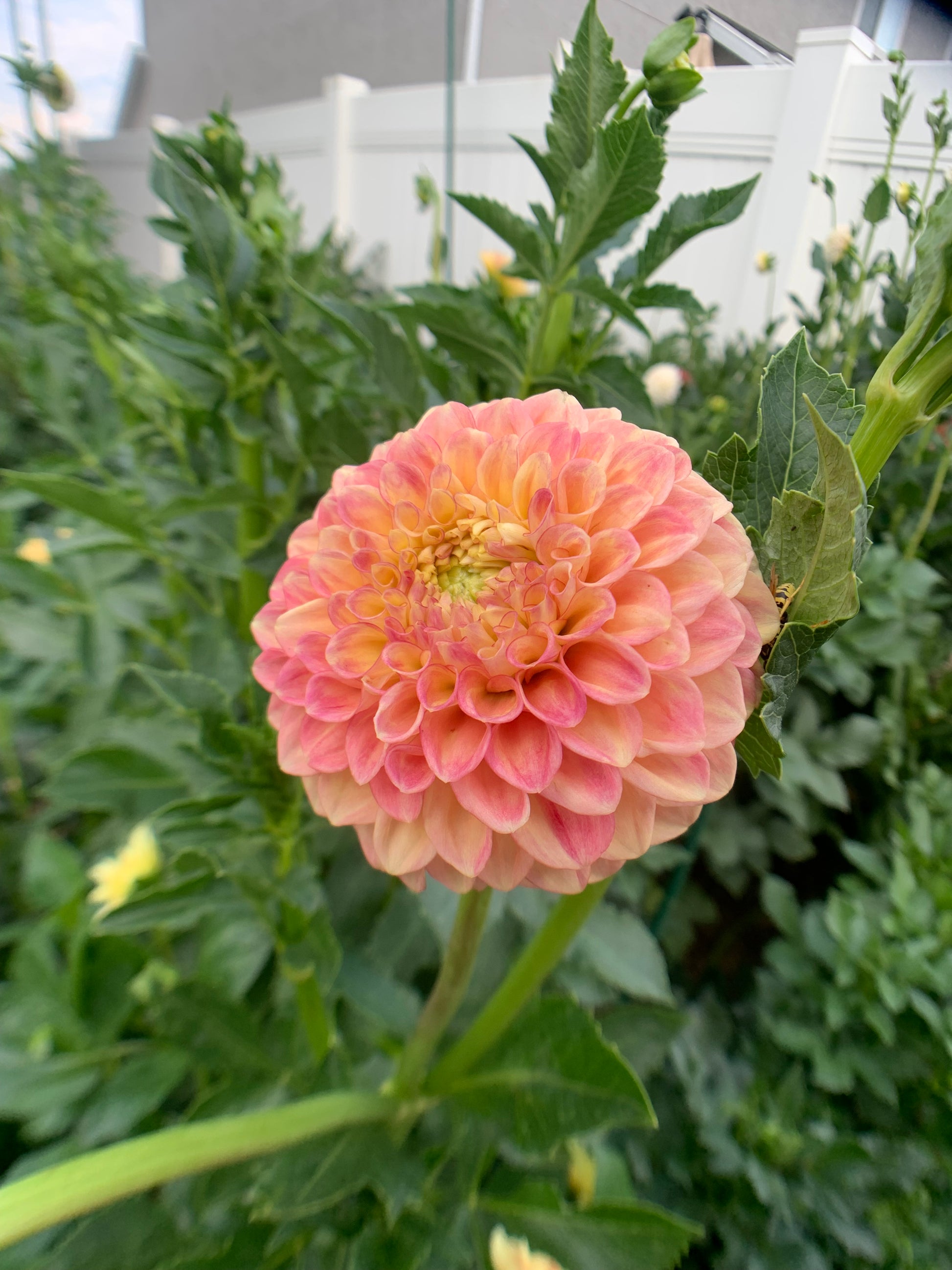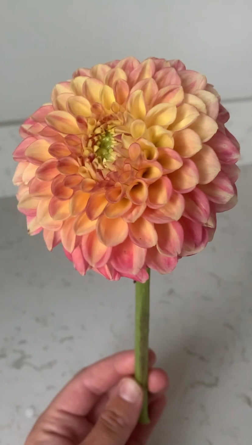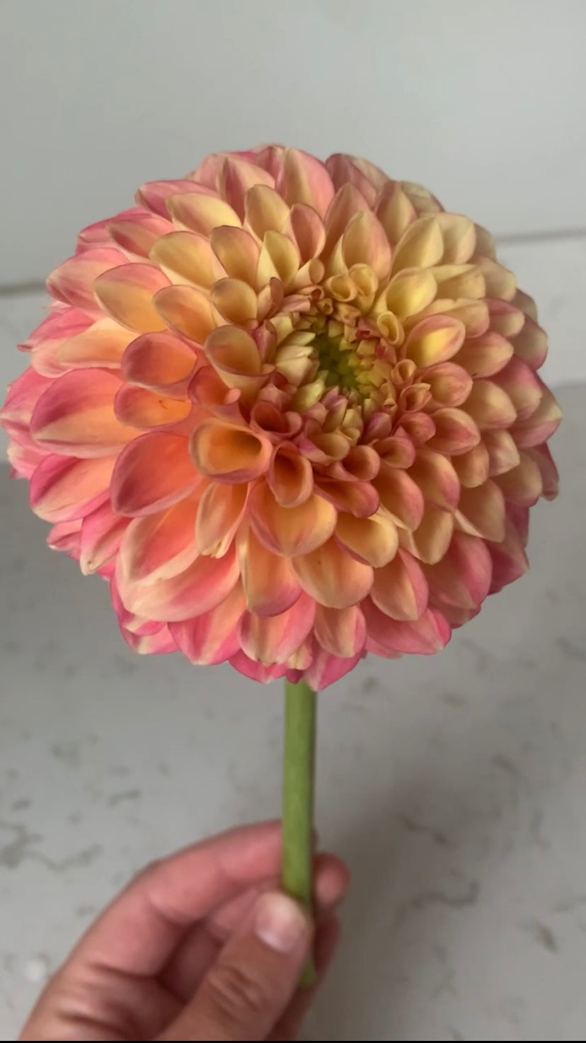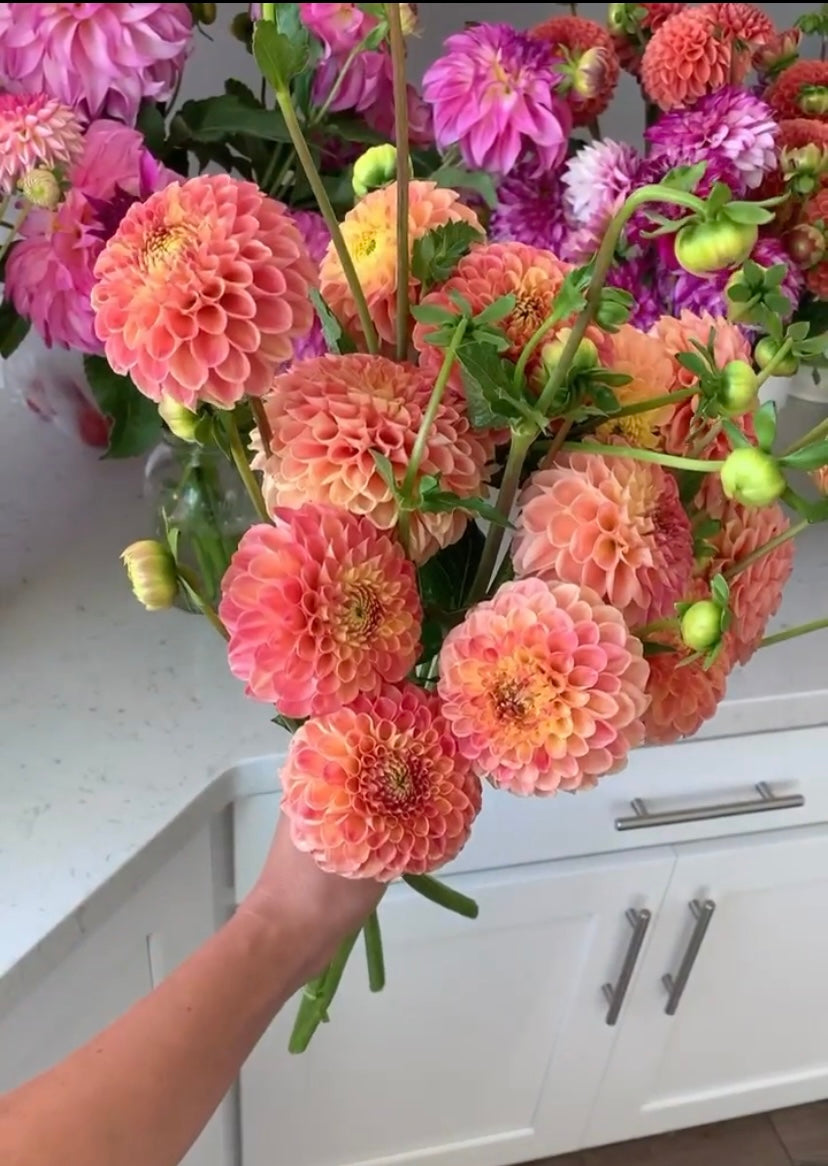 Pink and yellow ball shaped blooms, great long stems for cutting, great vase life, tons of blooms, one of my go to favorites!